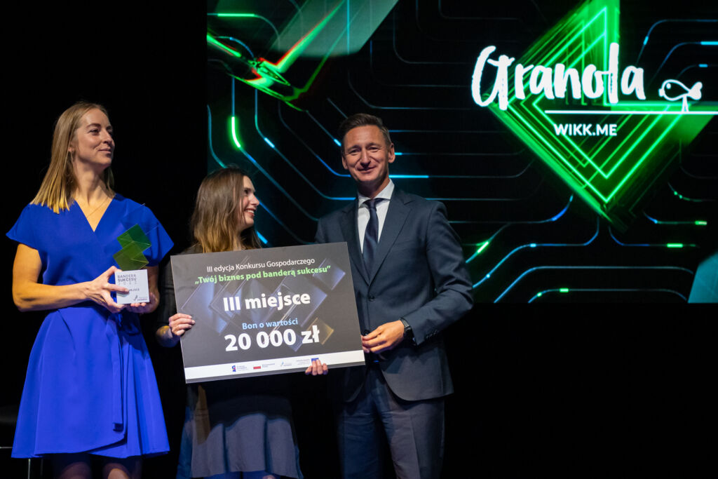 Widząc jak silne grono przedsiębiorczyń i przedsiębiorców stanowi finałowa 10 trudno było się cokolwiek przewidzieć, i kiedy kolejni finaliści zapraszani byli na scenę by odebrać nagrodę, a my dalej wyczekiwałyśmy, aż padnie nazwa naszej firmy, to emocje szły w górę bo wiedziałyśmy, że im dłużej czekamy tym większe nasze szanse na zdobycie nagrody. I w końcu padają magiczne słowa z ust Marszałka Województwa Olgierda Geblewicza, że trzecie miejsce i brązowa bandera sukcesu wędruje w nasze ręce! Manufaktura Granoli wikk.mpress.cc zdobywa 3 miejsce w konkursie „Twój biznes pod banderą sukcesu”. To wielki dla nas sukces, który nie byłby możliwy gdyby nie ambitny, zgrany, kobiecy zespół i nieustanne wsparcie naszych bliskich. Ta nagroda to mocny, dobry wiatr w nasze żagle! Ale to nie wszystko! Granola wikk.mpress.cc zdobywa również nagrodę publiczności. I ta nagroda już zupełnie rozmiękczyła nasze granolowe serca. Dziękujemy!