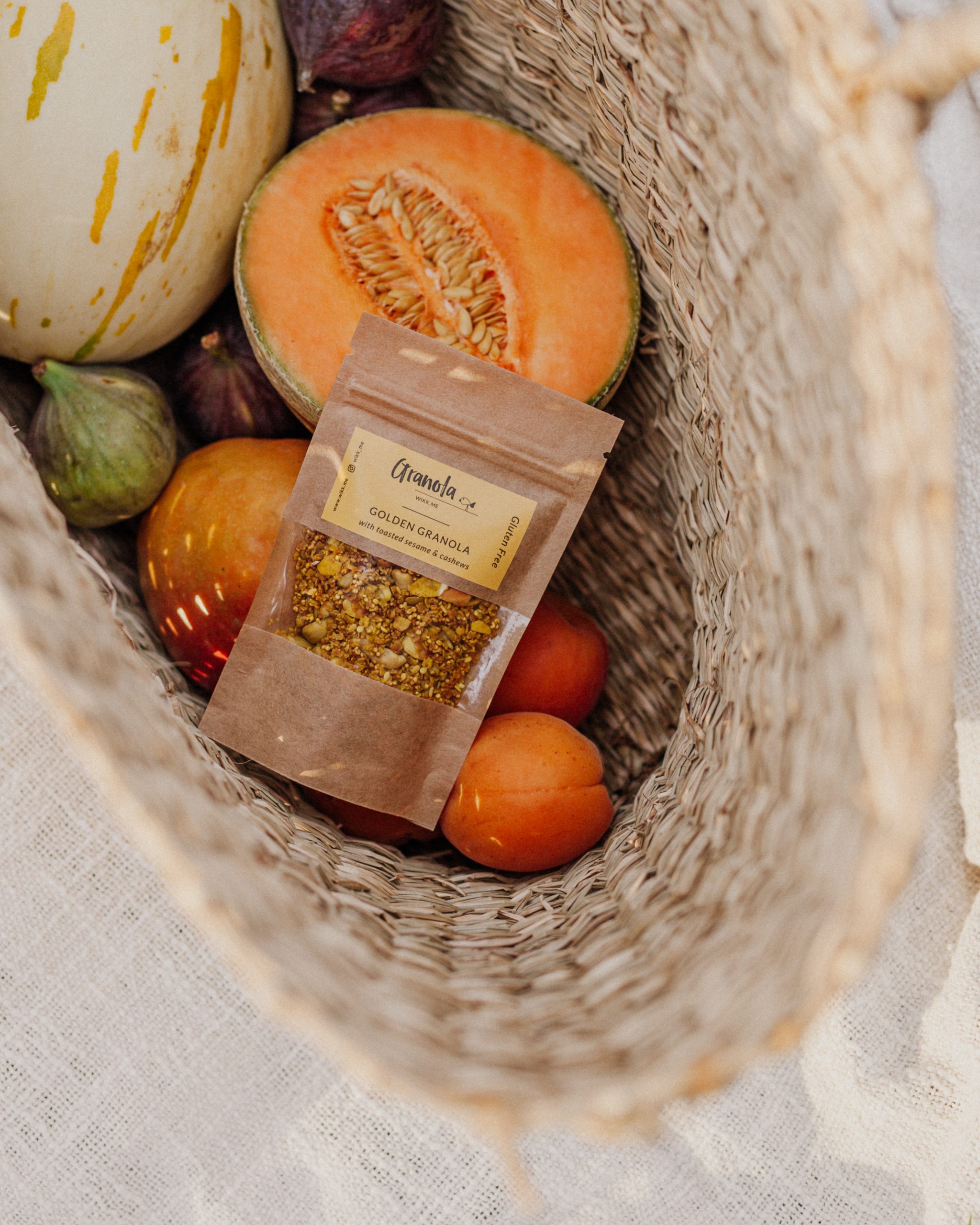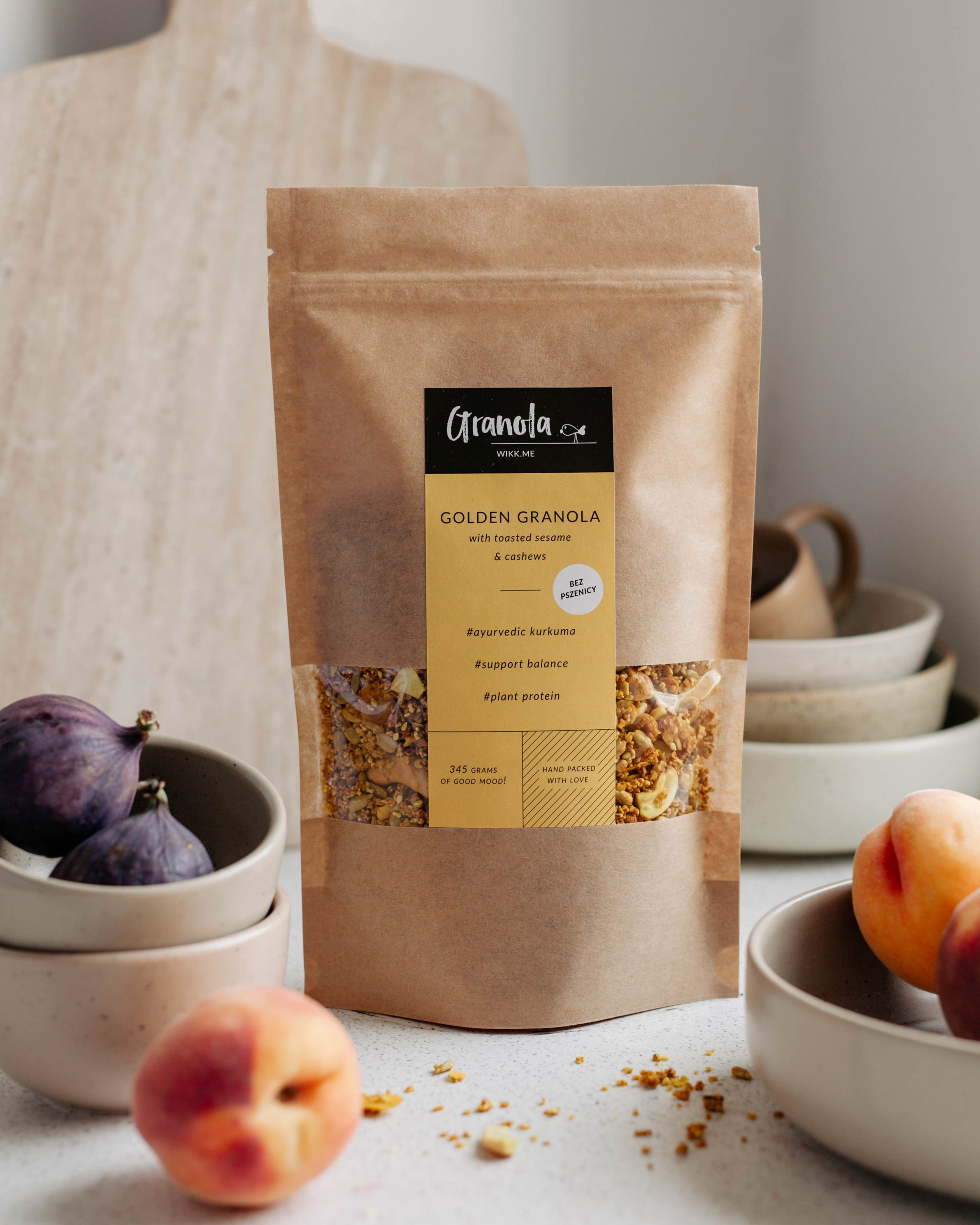 Nowa ulepszona wersja naszego bestsellera. Golden Granola wypiekana na bezglutenowych płatkach owsianych BIO. Golden Granola zawdzięcza swój oryginalny kolor, zawartej w niej kurkumie. Aby zwiększyć biodostępność kurkuminy i maksymalnie wykorzystać jej prozdrowotny potencjał połączyliśmy ją z piperyną zawartą w czarnym pieprzu. Nasza Golden Granola zawiera dużą ilość nerkowców, których część pieczona jest z całą masą, a część – prażonych dodawanych na sam koniec. Ich połączenie z sezamem i przyprawami daje oryginalny smak, który wprawia w ogromną przyjemność. Sprawdź to!