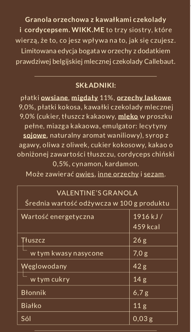 Rozsmakuj się w Valentine’s Granoli, która łączy w sobie bardzo kremową, belgijską czekoladę o karmelowych i waniliowych nutach ze starannie wyselekcjonowanymi orzechami pekan, laskowymi i migdałami blanszowanymi.