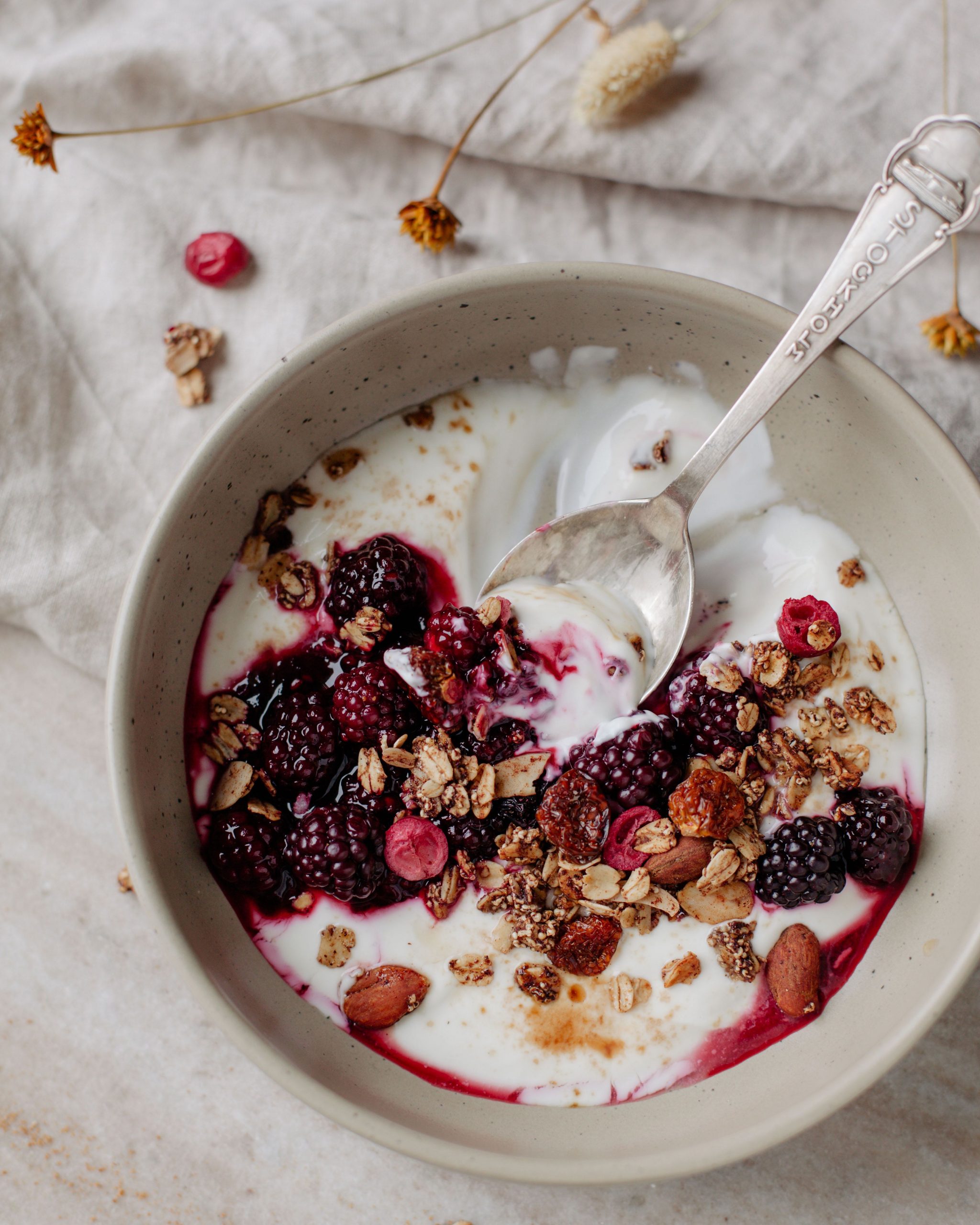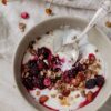 345g COZY CHERRY with almonds & cinnamon – granola z dużą ilością całych migdałów, płatków migdałowych i owsianych, wypiekana z dodatkiem miodu i intensywnych w smaku przypraw korzennych. Z dodatkiem wiśni z polskich sadów oraz miechunki, zawiera dodatek superfoods korzenia maca. Rozgrzeje najmroźniejsze jesienne i zimowe poranki oraz wzmocni odporność.