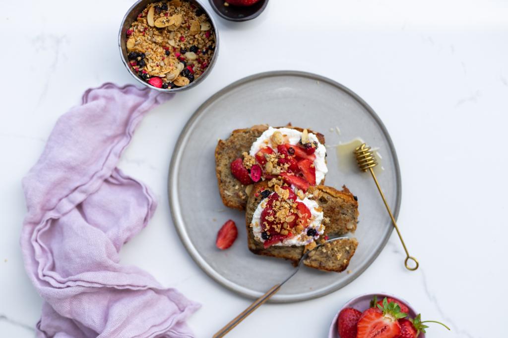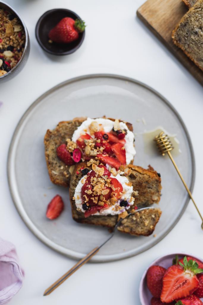 Jako że ostatnio internet ogarnął trend na bananowy chlebek to stwierdziłyśmy że podamy pomysł na bananowe tosty z granolą, pysznym mascarpone i naszą lekką granolą bezglutenu wikk.mpress.cc SUPER BERRY.